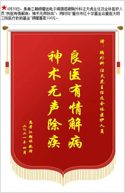 患者江朝顺赠送电子锦旗感谢胸外科汪天虎主任及全体医护人员,并向医疗救助基金捐赠善款100元-锦旗-患者心声-患者服务-重庆医科大学附属第三医院【官方网站】