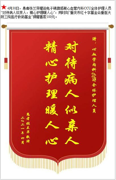 患者张兰萍赠送电子锦旗感谢心血管内科CCU全体护理人员,并向医疗救助基金捐赠善款100元-锦旗-患者心声-患者服务-重庆医科大学附属第三医院【官方网站】