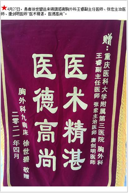 患者徐世碧送来锦旗感谢胸外科王睿副主任医师、张宏主治医师、唐剑明医师“医术精湛,医德高尚”-锦旗-患者心声-患者服务-重庆医科大学附属第三医院【官方网站】