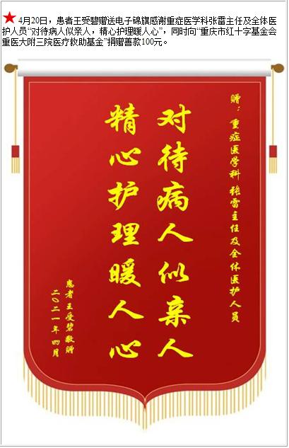 患者王受碧赠送电子锦旗感谢重症医学科张雷主任及全体医护人员,并向医疗救助基金捐赠善款100元-锦旗-患者心声-患者服务-重庆医科大学附属第三医院【官方网站】