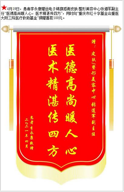 患者李永康赠送电子锦旗感谢皮肤/整形美容中心张道军副主任,并向医疗救助基金捐赠善款100元-锦旗-患者心声-患者服务-重庆医科大学附属第三医院【官方网站】