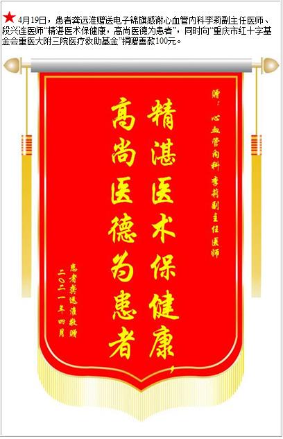 患者龚远淮赠送电子锦旗感谢心血管内科李莉副主任医师等人,并向医疗救助基金捐赠善款100元-锦旗-患者心声-患者服务-重庆医科大学附属第三医院【官方网站】