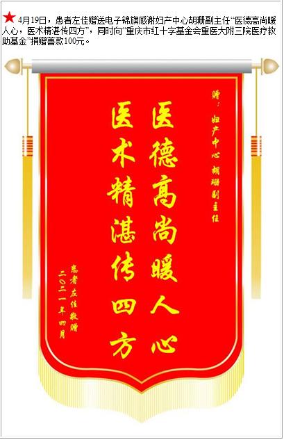 患者左佳赠送电子锦旗感谢妇产中心胡珊副主任,并向医疗救助基金捐赠善款100元-锦旗-患者心声-患者服务-重庆医科大学附属第三医院【官方网站】