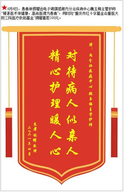 患者林辉赠送电子锦旗感谢内分泌疾病中心魏玉梅主管护师,并向医疗救助基金捐赠善款100元-锦旗-患者心声-患者服务-重庆医科大学附属第三医院【官方网站】