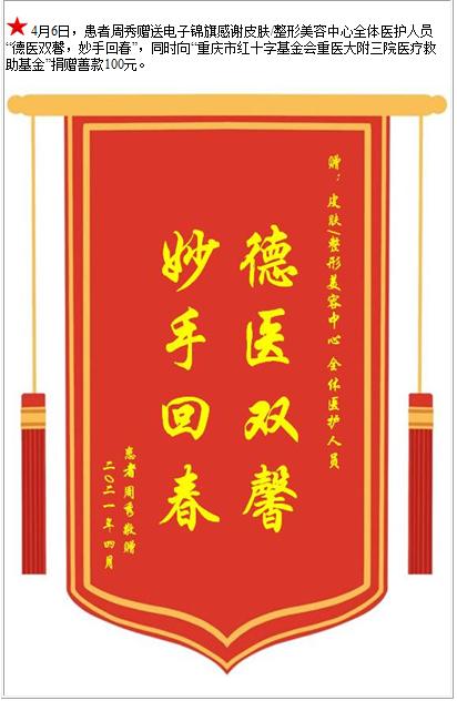 患者周秀赠送电子锦旗感谢皮肤/整形美容中心全体医护人员,并向医疗救助基金捐赠善款100元-锦旗-患者心声-患者服务-重庆医科大学附属第三医院【官方网站】