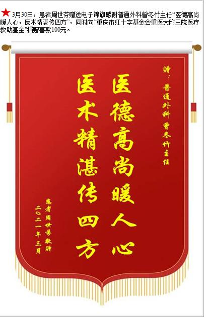 患者周世芬赠送电子锦旗感谢普通外科曾冬竹主任,并向医疗救助基金捐赠善款100元-锦旗-患者心声-患者服务-重庆医科大学附属第三医院【官方网站】