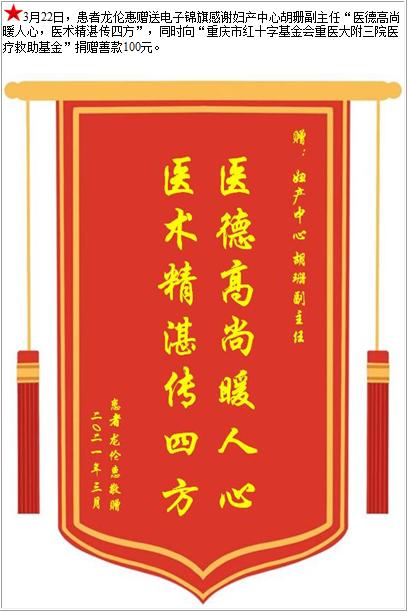 患者龙伦惠赠送电子锦旗感谢妇产中心胡珊副主任,并向医疗救助基金捐赠善款100元-锦旗-患者心声-患者服务-重庆医科大学附属第三医院【官方网站】