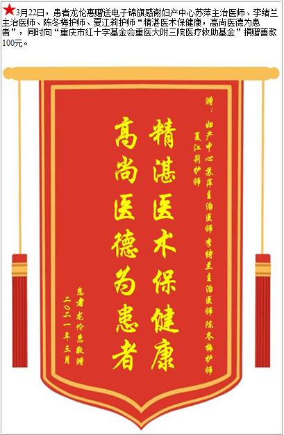 患者龙伦惠赠送电子锦旗感谢妇产中心苏萍主治医师等人,并向医疗救助基金捐赠善款100元。-锦旗-患者心声-患者服务-重庆医科大学附属第三医院【官方网站】