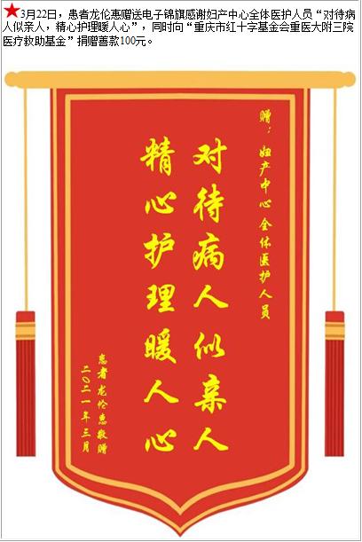 患者龙伦惠赠送电子锦旗感谢妇产中心全体医护人员,并向医疗救助基金捐赠善款100元-锦旗-患者心声-患者服务-重庆医科大学附属第三医院【官方网站】