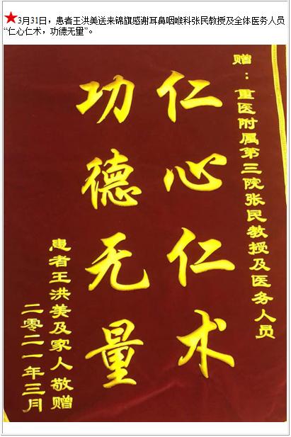 患者王洪美送来锦旗感谢耳鼻咽喉科张民教授及全体医务人员“仁心仁术,功德无量”-锦旗-患者心声-患者服务-重庆医科大学附属第三医院【官方网站】