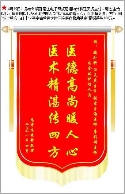 患者陈晓静赠送电子锦旗感谢胸外科汪天虎主任等人及全体护理人员,并向医疗救助基金捐赠善款100元-锦旗-患者心声-患者服务-重庆医科大学附属第三医院【官方网站】