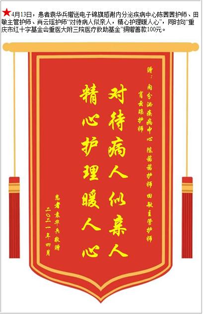 患者袁华兵赠送电子锦旗感谢内分泌疾病中心陈茜茜护师等人,并向医疗救助基金捐赠善款100元-锦旗-患者心声-患者服务-重庆医科大学附属第三医院【官方网站】