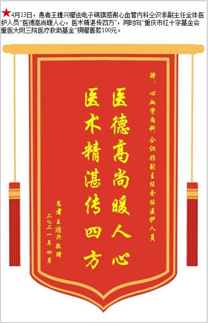 患者王鐘兴赠送电子锦旗感谢心血管内科仝识非副主任全体医护人员,并向医疗救助基金捐赠善款100元-锦旗-患者心声-患者服务-重庆医科大学附属第三医院【官方网站】