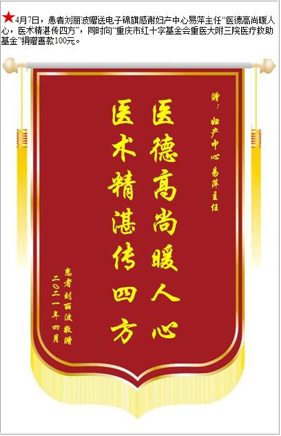 患者刘丽波赠送电子锦旗感谢妇产中心易萍主任,并向医疗救助基金捐赠善款100元-锦旗-患者心声-患者服务-重庆医科大学附属第三医院【官方网站】