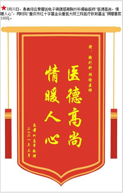患者何应章赠送电子锦旗感谢胸外科操瑜医师,并向医疗救助基金捐赠善款100元-锦旗-患者心声-患者服务-重庆医科大学附属第三医院【官方网站】
