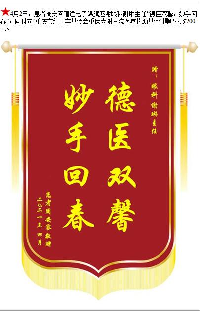 患者周安容赠送电子锦旗感谢眼科谢琳主任,并向医疗救助基金捐赠善款200元-锦旗-患者心声-患者服务-重庆医科大学附属第三医院【官方网站】