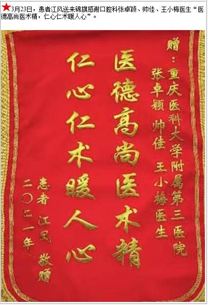 患者江风送来锦旗感谢口腔科张卓颖、帅佳、王小梅医生“医德高尚医术精,仁心仁术暖人心”-锦旗-患者心声-患者服务-重庆医科大学附属第三医院【官方网站】