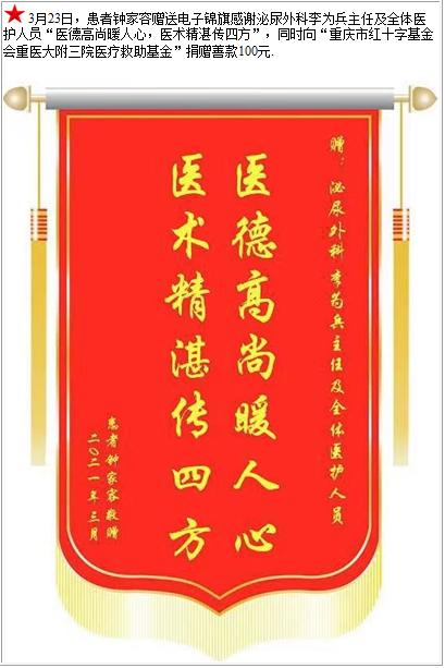 患者钟家容赠送电子锦旗感谢泌尿外科李为兵主任及全体医护人员,并向医疗救助基金捐赠善款100元-锦旗-患者心声-患者服务-重庆医科大学附属第三医院【官方网站】