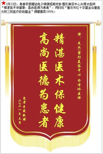 患者李薇赠送电子锦旗感谢皮肤/整形美容中心余傅冰医师,并向医疗救助基金捐赠善款100元-锦旗-患者心声-患者服务-重庆医科大学附属第三医院【官方网站】