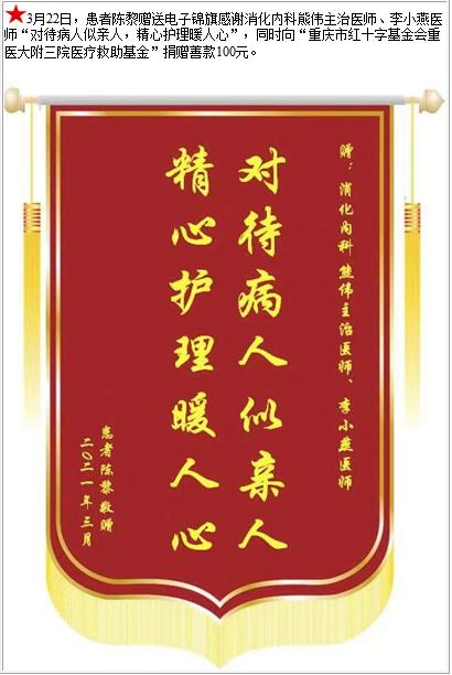 患者陈黎赠送电子锦旗感谢消化内科熊伟主治医师等人,并向医疗救助基金捐赠善款100元-锦旗-患者心声-患者服务-重庆医科大学附属第三医院【官方网站】