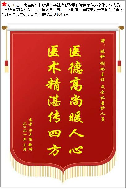 患者廖年桂赠送电子锦旗感谢眼科谢琳主任及全体医护人员,并向医疗救助基金捐赠善款100元-锦旗-患者心声-患者服务-重庆医科大学附属第三医院【官方网站】