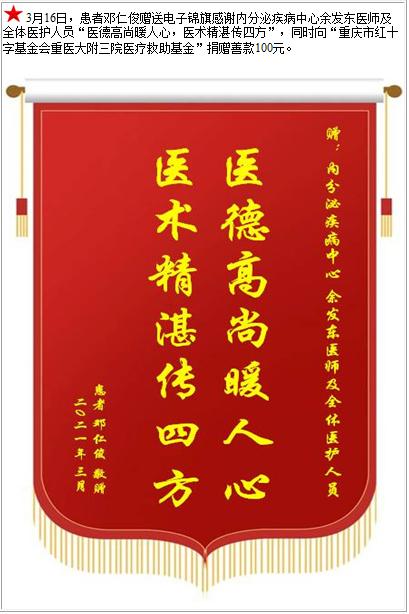 患者邓仁俊赠送电子锦旗感谢内分泌疾病中心余发东医师及全体医护人员,并向医疗救助基金捐赠善款100元-锦旗-患者心声-患者服务-重庆医科大学附属第三医院【官方网站】