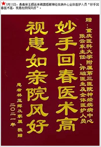患者林玉辉送来锦旗感谢神经疾病中心全体医护人员“妙手回春医术高,视患如亲院风好”-锦旗-患者心声-患者服务-重庆医科大学附属第三医院【官方网站】