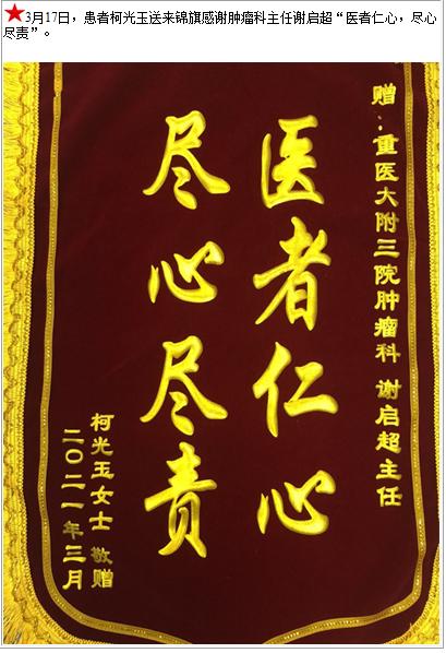 患者柯光玉送来锦旗感谢肿瘤科主任谢启超“医者仁心,尽心尽责”-锦旗-患者心声-患者服务-重庆医科大学附属第三医院【官方网站】