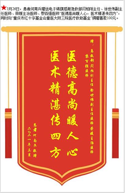 患者何南兵赠送电子锦旗感谢急救部闫柏刚主任等人,并向医疗救助基金捐赠善款100元-锦旗-患者心声-患者服务-重庆医科大学附属第三医院【官方网站】