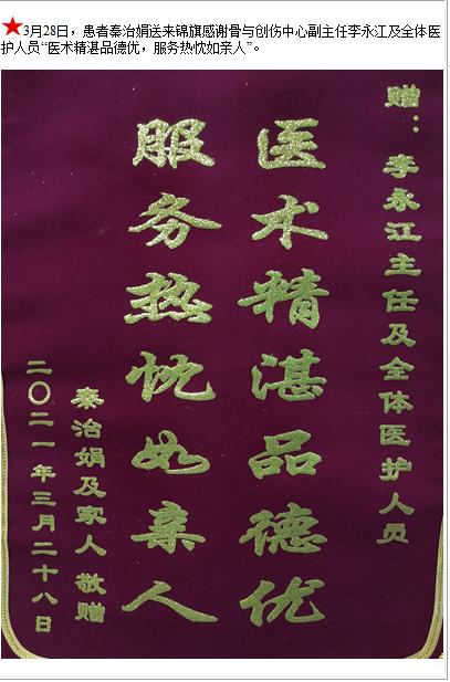 患者秦治娟送来锦旗感谢骨与创伤中心副主任李永江及全体医护人员“医术精湛品德优,服务热忱如亲人”-锦旗-患者心声-患者服务-重庆医科大学附属第三医院【官方网站】