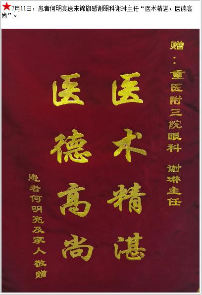 患者何明亮送来锦旗感谢眼科谢琳主任“医术精湛,医德高尚”-锦旗-患者心声-患者服务-重庆医科大学附属第三医院【官方网站】