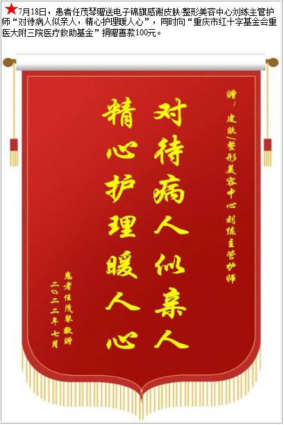 患者任茂琴赠送电子锦旗感谢皮肤/整形美容中心刘练主管护师,并向医疗救助基金捐赠善款100元-锦旗-患者心声-患者服务-重庆医科大学附属第三医院【官方网站】