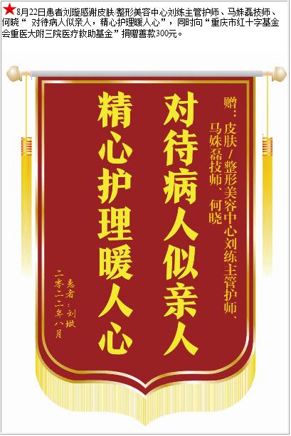 患者刘璇感谢皮肤/整形美容中心刘练主管护师等人,并向医疗救助基金捐赠善款300元-锦旗-患者心声-患者服务-重庆医科大学附属第三医院【官方网站】