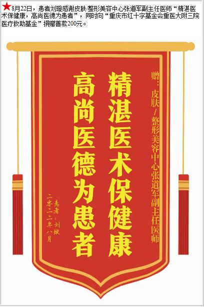 患者刘璇感谢皮肤/整形美容中心张道军副主任医师,并向医疗救助基金捐赠善款200元-锦旗-患者心声-患者服务-重庆医科大学附属第三医院【官方网站】