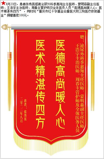 患者张秀英感谢泌尿外科季惠翔主任医师等人及全体医务人员,并向医疗救助基金捐赠善款100元-锦旗-患者心声-患者服务-重庆医科大学附属第三医院【官方网站】