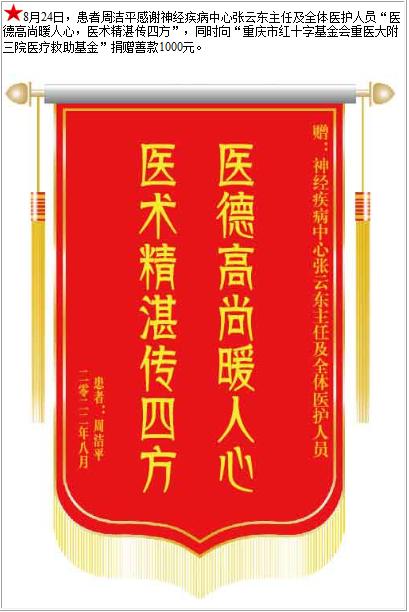 患者周洁平感谢神经疾病中心张云东主任及全体医护人员,并向医疗救助基金捐赠善款1000元-锦旗-患者心声-患者服务-重庆医科大学附属第三医院【官方网站】