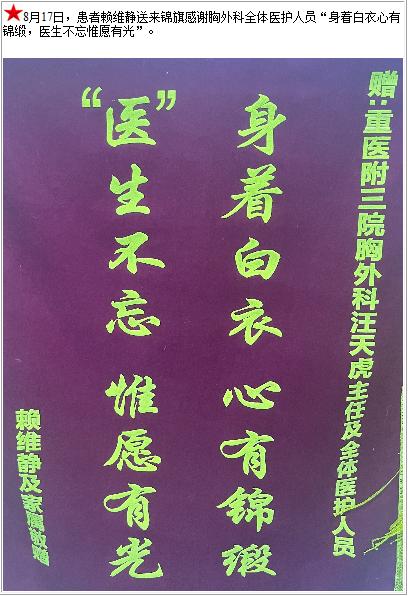 患者赖维静送来锦旗感谢胸外科全体医护人员“身着白衣心有锦缎,医生不忘惟愿有光”-锦旗-患者心声-患者服务-重庆医科大学附属第三医院【官方网站】