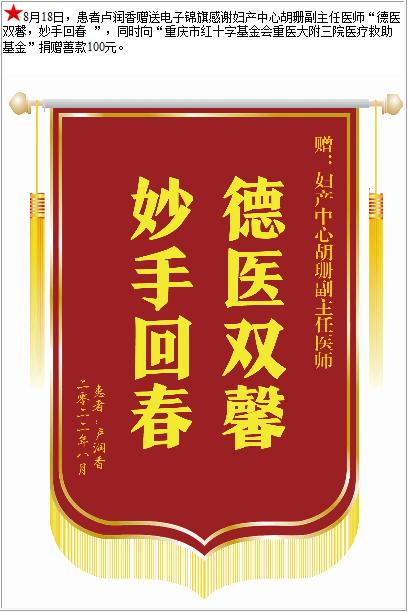 患者卢润香赠送电子锦旗感谢妇产中心胡珊副主任医师,并向医疗救助基金捐赠善款100元-锦旗-患者心声-患者服务-重庆医科大学附属第三医院【官方网站】