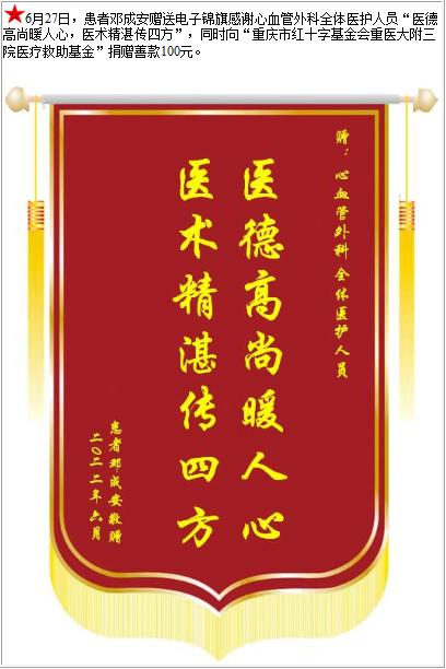 患者邓成安赠送电子锦旗感谢心血管外科全体医护人员,并向医疗救助基金捐赠善款100元-锦旗-患者心声-患者服务-重庆医科大学附属第三医院【官方网站】