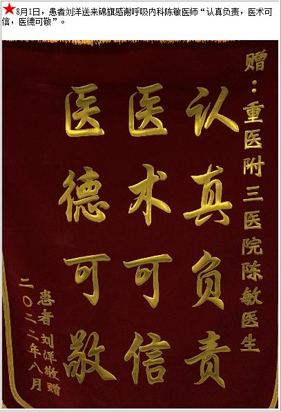 患者刘洋送来锦旗感谢呼吸内科陈敏医师“认真负责,医术可信,医德可敬”-锦旗-患者心声-患者服务-重庆医科大学附属第三医院【官方网站】