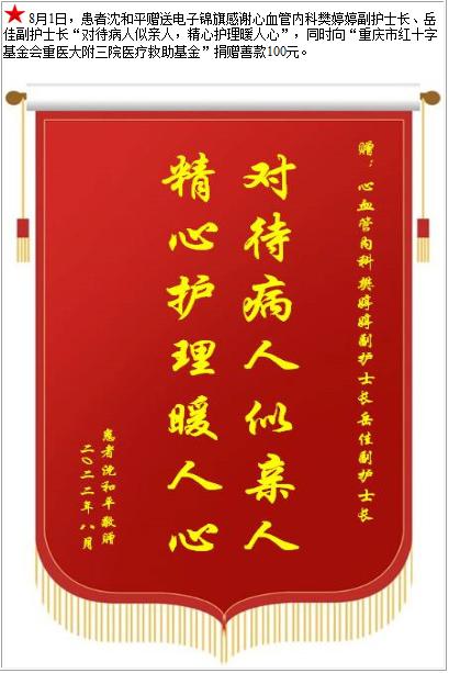 患者沈和平赠送电子锦旗感谢心血管内科樊婷婷副护士长等人,并向医疗救助基金捐赠善款100元-锦旗-患者心声-患者服务-重庆医科大学附属第三医院【官方网站】