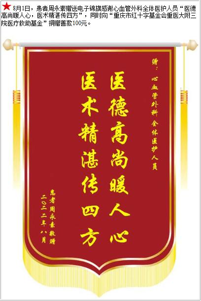 患者周永素赠送电子锦旗感谢心血管外科全体医护人员,并向医疗救助基金捐赠善款100元-锦旗-患者心声-患者服务-重庆医科大学附属第三医院【官方网站】