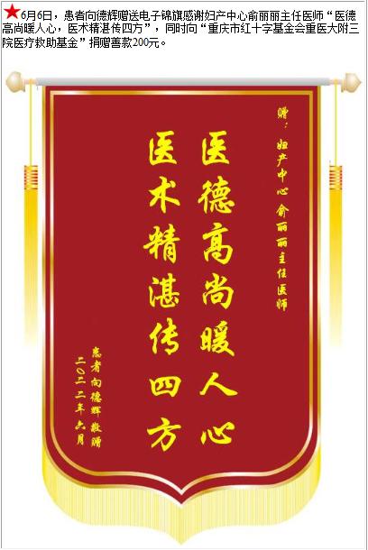 患者向德辉赠送电子锦旗感谢妇产中心俞丽丽主任医师,并向医疗救助基金捐赠善款200元-锦旗-患者心声-患者服务-重庆医科大学附属第三医院【官方网站】