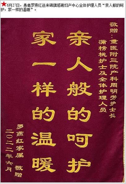 患者罗燕红送来锦旗感谢妇产中心全体护理人员“亲人般的呵护,家一样的温暖”-锦旗-患者心声-患者服务-重庆医科大学附属第三医院【官方网站】