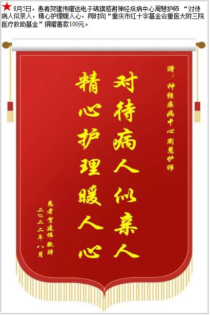 患者贺建伟赠送电子锦旗感谢神经疾病中心周慧护师,并向医疗救助基金捐赠善款100元-锦旗-患者心声-患者服务-重庆医科大学附属第三医院【官方网站】
