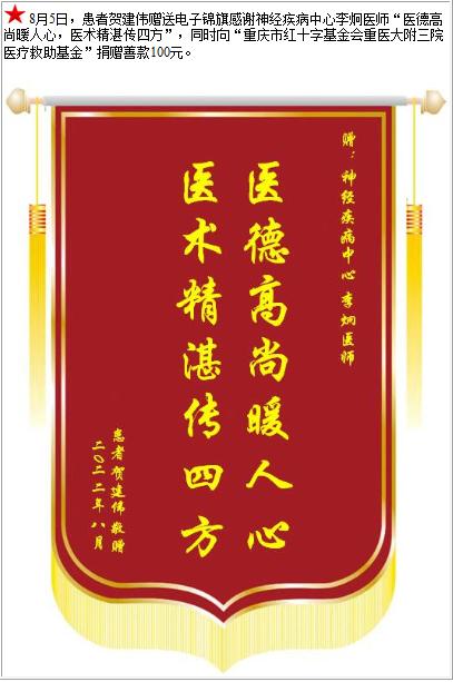 患者贺建伟赠送电子锦旗感谢神经疾病中心李炯医师,并向医疗救助基金捐赠善款100元-锦旗-患者心声-患者服务-重庆医科大学附属第三医院【官方网站】