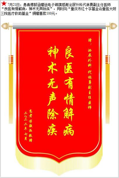 患者傅毅涵赠送电子锦旗感谢泌尿外科代林勇副主任医师,并向医疗救助基金捐赠善款100元-锦旗-患者心声-患者服务-重庆医科大学附属第三医院【官方网站】