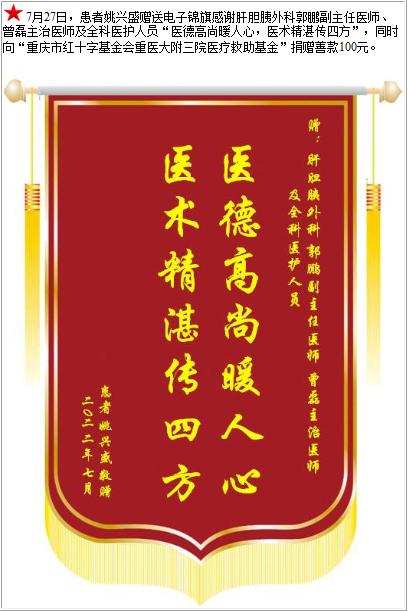 患者姚兴盛赠送电子锦旗感谢肝胆胰外科郭鹏副主任医师等人及全科医护人员,并向医疗救助基金捐赠善款100元-锦旗-患者心声-患者服务-重庆医科大学附属第三医院【官方网站】
