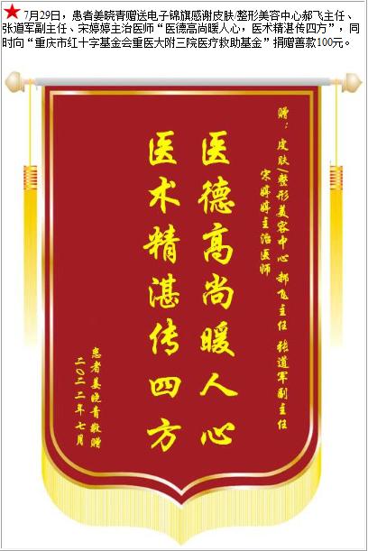 患者姜晓青赠送电子锦旗感谢皮肤/整形美容中心郝飞主任等人,并向医疗救助基金捐赠善款100元-锦旗-患者心声-患者服务-重庆医科大学附属第三医院【官方网站】