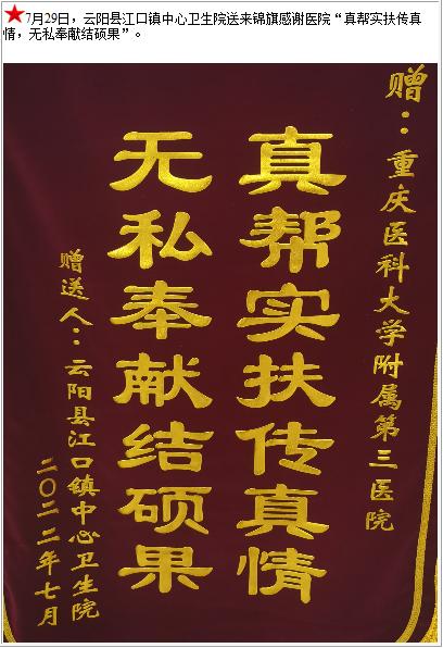 云阳县江口镇中心卫生院送来锦旗感谢医院“真帮实扶传真情,无私奉献结硕果”-锦旗-患者心声-患者服务-重庆医科大学附属第三医院【官方网站】